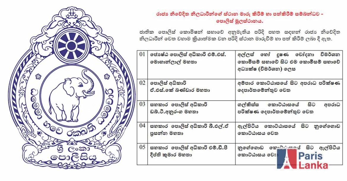 ජාතික පොලිස් කොමිෂන් සභාවේ අනුමැතිය මත වහාම ක්රියාත්මක වන පරිදී පොලිස් නිලධාරීන් රැසකට ස්ථාන මාරු වීම් හා පත් කිරීම් ලබා දී තිබෙනවා.